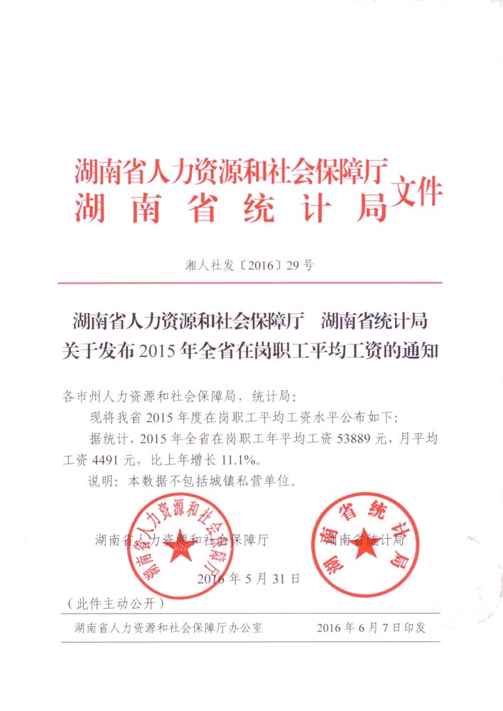 湖南省人力資源和社會保障廳,湖南省統(tǒng)計局關于發(fā)布2015年全省在崗職工平均工資的通知