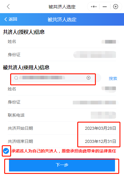 第三步:輸入被綁定人身份證號,選擇共濟(jì)時間,勾選承諾,點擊下一步,綁定成功。